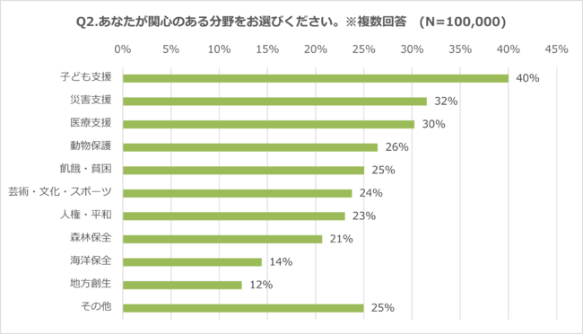 寄付で最も関心がある分野は「子ども支援」(40%)。