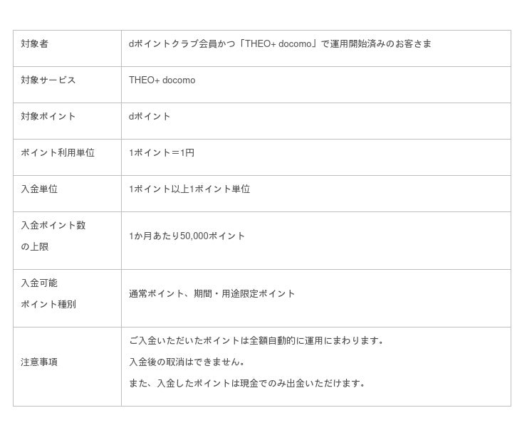 ・キャンペーン開始からポイント進呈までの間に、「THEO+ docomo」から出金、または解約を行なわないこと