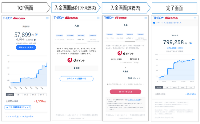 本機能が新たに提供されることで、dポイントを1ポイント=1円単位で、お金のデザインの提携金融機関においてお客さまが開設された「THEO+ docomo」の口座に入金することが可能(※2、※3)となります。これにより、お客さまは銀行振込やdカード積立などによる入金に加え、dポイントを活用して、資産運用サービスをご利用いただけるようになります。dポイントは通常ポイント、期間・用途限定ポイントともにご利用いただけます。