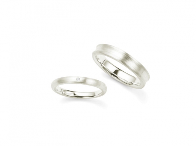 マットなヘアラインのテクスチャーがスタイリッシュな印象のペアリング。レディースは丸みのあるフェミニンなフォルムに、アクセントとしてダイヤモンドをセッティング。メンズはリバースアームでシャープなフォルムに仕上げた、デイリーでも身に着けやすいデザインです。