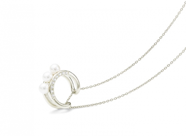 リングモチーフをトップにしたロングチェーンのネックレス。リングのトップにパールを3粒大胆にあしらい、リング両側面にはキュービックジルコニアをセッティング。ネックレスのトップはチェーンを外すと、ピンキーリングとして身に着けることができる2wayのアイテムです。