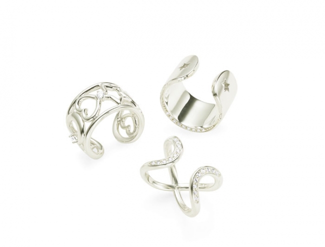 ボリュームリングの1つ目は、月・星・ハートのモチーフを連ねたオープンワークのリング。モチーフの間にキュービックジルコニアをあしらった数量限定のアイテムです。
