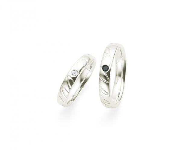 純シルバーのペアリングは、柔らかな丸いフォルムが優しい印象を引き出すジュエリー。レディースにはホワイトダイヤモンド、メンズにはブラックダイヤモンドをあしらったリングは、ふたつのリングを重ねると「Amore」の文字になるロマンティックなデザインです。
