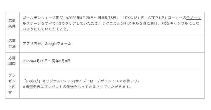 グリーンモンスター株式会社 (本社:東京都渋谷区 代表取締役:小川亮、以下グリーンモンスター)は、体験型FX投資学習スマホアプリ「FXなび」で提供している、FXをギャンブルにしないための本格的FX学習機能「STEP UP」をゴールデンウィーク期間中開放するとともに、抽選で「FXなび」オリジナルTシャツをGETできるキャンペーンを4月29日より開始することをお知らせいたします。