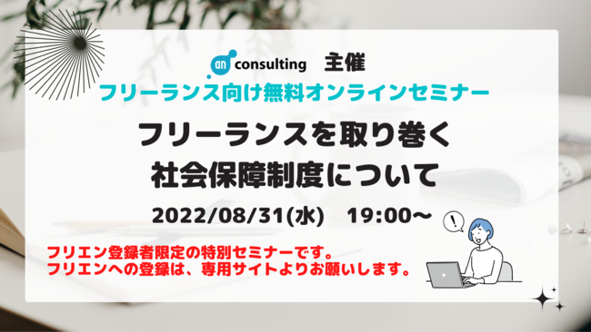 また、より多くのフリーランスの方に現在の社会保障制度についてや、本サービスについてお伝えしたいと思い、有識者による「フリーランスの社会保障制度」に関するセミナーを開催する運びとなりました。