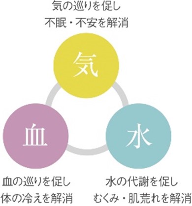 東洋医学で人間の体は、気の巡りを促し不眠・不安を解消する「気」、血の巡りを促し体の冷えを解消する「血」、水の代謝を促しむくみ・肌荒れを解消する「水」によって成り立っており、このバランスが崩れると体に不調をきたすと考えられている。Minotte Tea巡はこの考えに基づき、漢方素材を配合している。