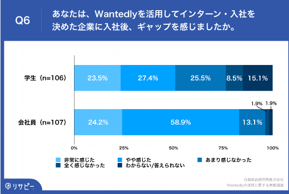 「Q6.あなたは、Wantedlyを活用してインターン・入社を決めた企業に入社後、ギャップを感じましたか。」と質問したところ、学生(n=106)は「非常に感じた」が23.5%、「やや感じた」が27.4%、会社員(n=107)は「非常に感じた」が24.2%、「やや感じた」が58.9%という回答となりました。