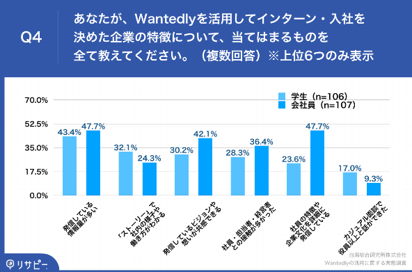 「Q4.あなたが、Wantedlyを活用してインターン・入社を決めた企業の特徴について、当てはまるものを全て教えてください。(複数回答)」と質問したところ、学生(n=106)は「発信している情報量が多い」が43.4%、「「ストーリー」で社内の様子や働き方がわかる」が32.1%、「発信しているビジョンや想いが共感できる」が30.2%、会社員(n=107)は「発信している情報量が多い」が47.7%、「社員の特徴や企業文化を詳細に発信している」が47.7%、「発信しているビジョンや想いが共感できる」が42.1%という回答となりました。