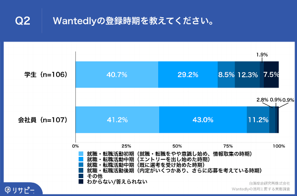 「Q2.Wantedlyの登録時期を教えてください。」と質問したところ、学生(n=106)は「就職・転職活動初期(就職・転職をやや意識し始め、情報取集の時期)」が40.7%、「就職・転職活動中期(エントリーを出し始めた時期)」が29.2%、会社員(n=107)は「就職・転職活動初期(就職・転職をやや意識し始め、情報取集の時期)」が41.2%、「就職・転職活動中期(エントリーを出し始めた時期)」が43.0%という回答となりました。