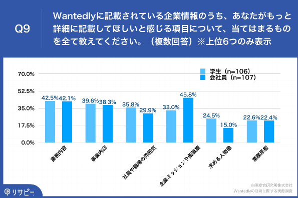「Q9.Wantedlyに記載されている企業情報のうち、あなたがもっと詳細に記載してほしいと感じる項目について、当てはまるものを全て教えてください。(複数回答)」と質問したところ、学生(n=106)は「業務内容」が42.5%、「事業内容」が39.6%、「社員や職場の雰囲気」が35.8%、会社員(n=107)は「企業ミッションや価値観」が45.8%、「業務内容」が42.1%、「事業内容」が38.3%という回答となりました。
