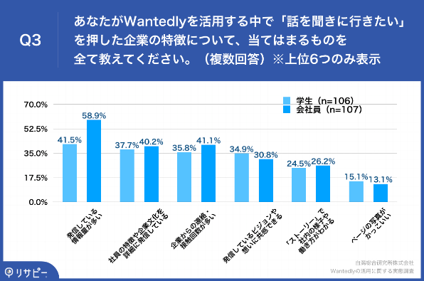 Wantedlyの「話を聞きに行きたい」を押した企業は学生、社会人ともに「発信している情報量が多い」が最多