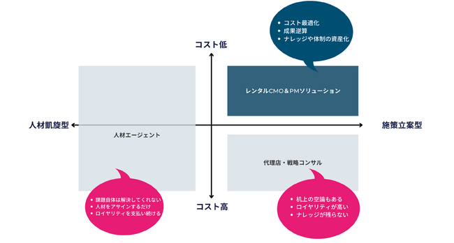 弊社はその部分を、プロフェッショナルを「インハウス」という正社員に近い形で、弊社内のナレッジと共にクライアントへ差配し解決します。