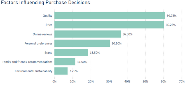 購入決定時に最も影響する要因として、「品質」が最も高く、僅差で「価格」が続く。3位に「オンラインレビュー」がランクインし、「家族や友人からの勧め」を大きく上回る結果となった。