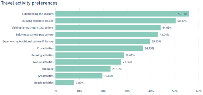 日本への訪問に関心を持つ回答者が選んだのは、1位「四季の自然(桜、紅葉、雪など)」55.9%、2位「日本食」50.4%、3位「有名観光地の訪問」44.1%と続きます。僅差で4位となったのは、「日本のポップカルチャー」43.0%で、今回の調査では20代、その中でも特に男性が84.0%を占めていることから、Z世代インドネシア男性にとって、日本のアニメや漫画、J-POPなどのポップカルチャーに十分な魅力を感じていることが伺えます。このような日本独自の文化を切り口に、関連するコンテンツやイベントなどを通して集客施策をとることも一つです。