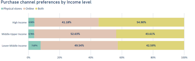 購入チャネルについて所得レベル別に見たところ、どの層においてもオンラインショッピングの利用度は約半数程度あり、特に高所得層の消費者の間では、オンラインと実店舗の両方を利用するオムニチャネルでのショッピング傾向が強いようです。デジタルネイティブであることから、積極的にオンラインの販売チャネルを活用しており、オンラインで情報収集したのち、実店舗で実物を見て購入するなど、複数のチャネルを行き来して商品を検討・購入することが多いため、それぞれのチャネルのメリットを上手く活かしながら彼らの購買意欲を高めていくシームレスな連携と戦略の検討が効果的なアプローチとなりそうです。