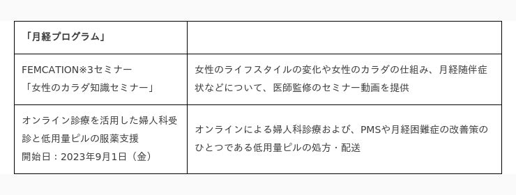 プログラムを通じてSansanの社員を対象に、婦人科医師監修のセミナー動画や、医療機関と連携したオンライン診療サービスの提供を行います。これにより生理痛や月経前症候群(以下、「PMS」)の改善、女性の健康課題への理解促進を支援します。