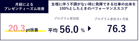 ◆試験導入では、月経プログラム利用後のパフォーマンススコアが20ポイント以上増加!月経に伴う欠勤も減少
