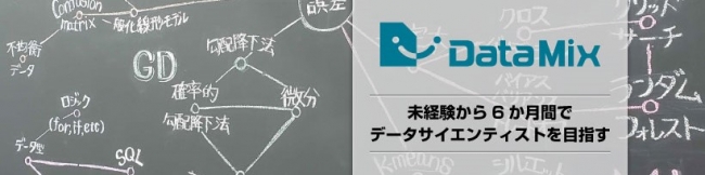 データミックスは2017年2月に設立以来、「データサイエンティスト育成コース」を軸としたスクールを展開し、統計学や機械学習、ディープラーニングなどの手法を駆使したデータ分析を通じて、深い洞察やビジネスにおける示唆を提供することができる人材の育成を行ってきました。これまでスキルアップ、キャリア構築を含め約600名以上にデータサイエンス関連の教育を提供してきた実績を有しています。また、データサイエンスについての企業研修やデータ分析コンサルティング、データ分析人材の紹介サービスなどを通して企業の競争力強化に貢献しています。