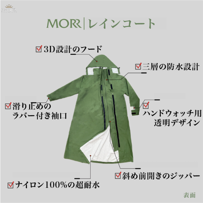 MORRは、防水加工が施された生地と3層の防水設計を採用し、極端な暴風雨ももろともしない、超高品質レインコートです。自転車バイクでの通勤通学や普段のお出かけ、キャンプ・アウトドアなど様々な場面でご利用いただけます。