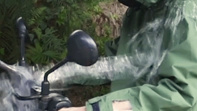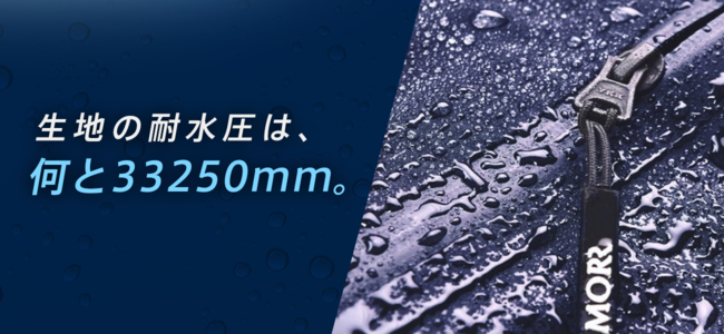 一般的なナイロン製傘の耐水性が250mm程度と言われていますが、MORRの耐水性は 30,000mmを超えており、MORRを着たままシャワーを浴びても中の服は濡れないほどの 耐水性を誇っています!