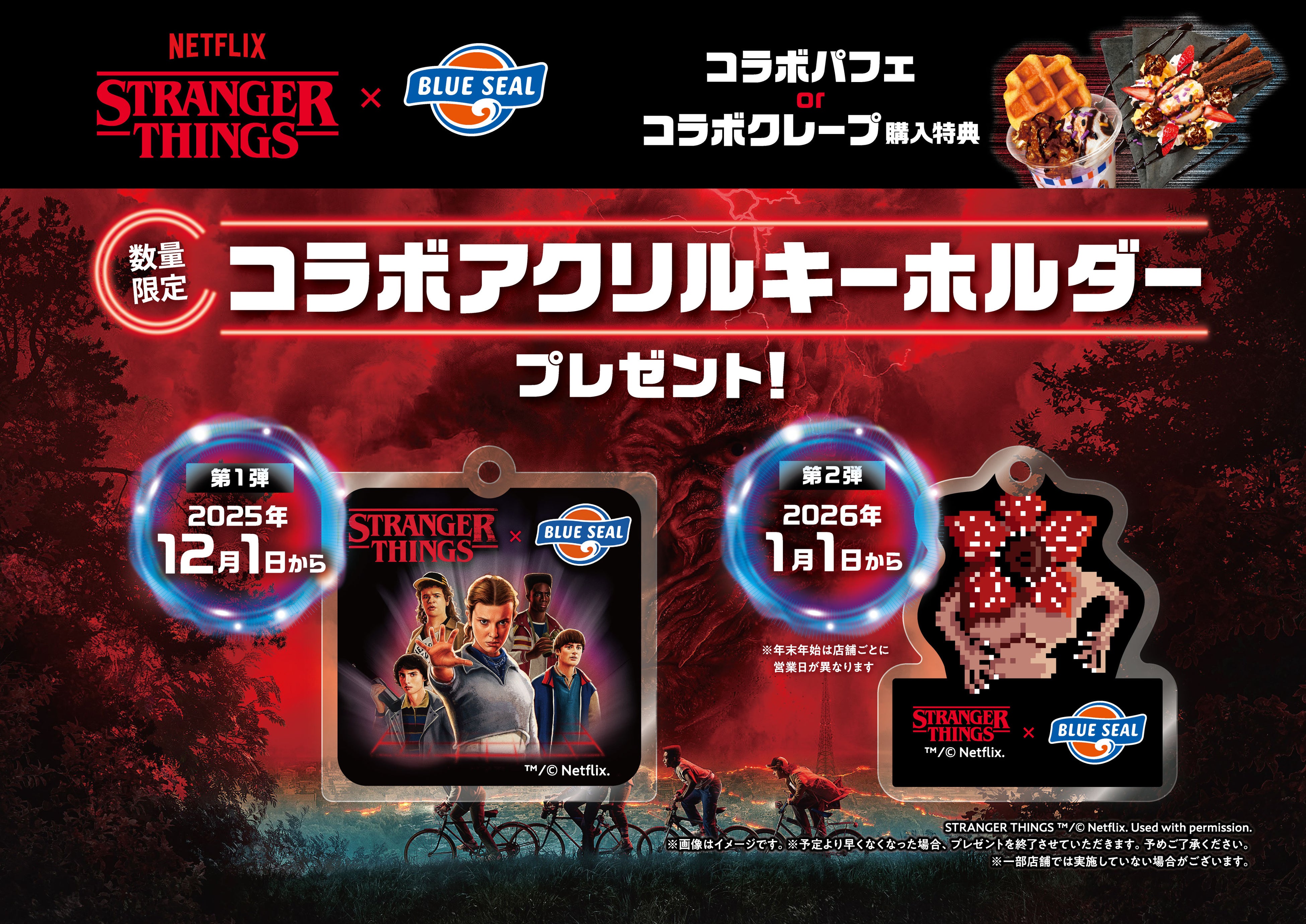 フォーモストブルーシール株式会社(本社:沖縄県浦添市、代表取締役社長 村上琢磨)は、「アイスがもたらす笑顔のために」の企業理念のもと「アメリカ生まれ、沖縄育ち」のブランドとして、商品・サービス展開を強化しております。その一環として、2016年のシーズン1配信以来、世界中で大ヒットし社会現象を巻き起こしているNetflixシリーズ「ストレンジャー・シングス 未知の世界」の最終章配信を記念して、2025年12月1日(月)からコラボレーション商品を発売する運びとなりました。「ストレンジャー・シングス」とブルーシールのコラボレーションは2023年の「ポーラーベアー」に続き2回目となります。