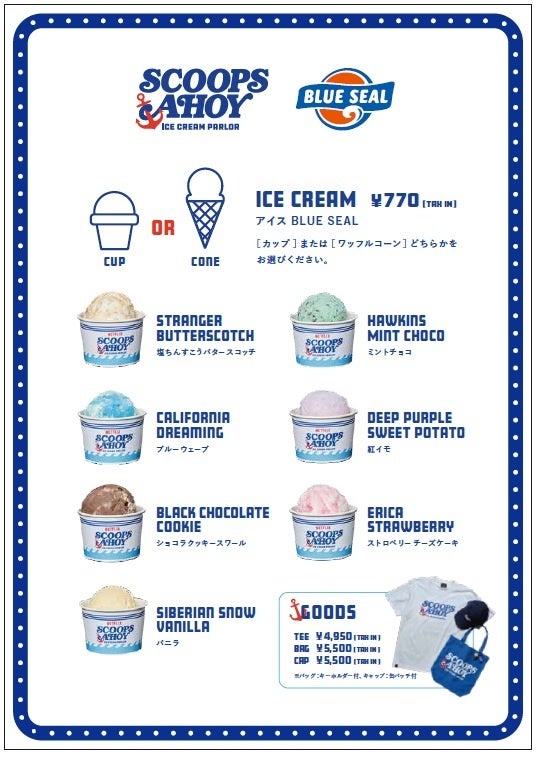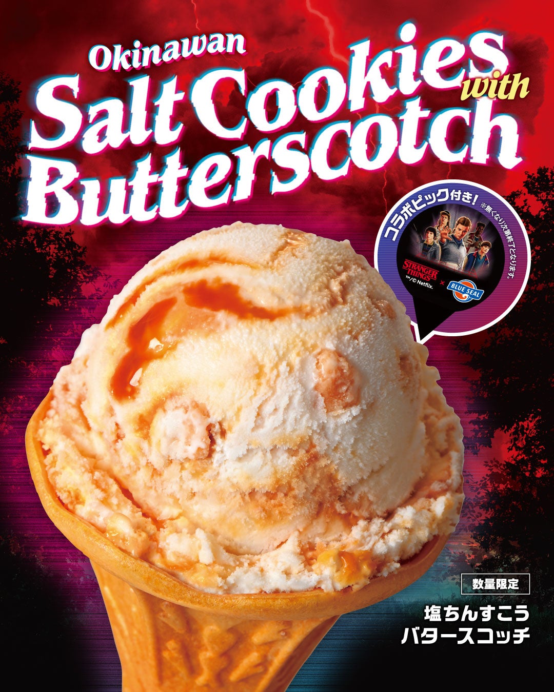「ストレンジャー・シングス」に登場するアイスクリームショップ「Scoops Ahoy」にも登場する「バタースコッチ」を、ブルーシールの人気NO.1フレーバー「塩ちんすこう」と組み合わせた限定フレーバーを数量限定で販売いたします。