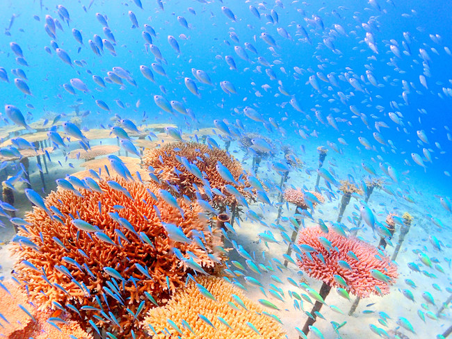 沖縄県近海には、世界的に見ても多種の色鮮やかで美しいサンゴが生息しています。サンゴ礁はダイビングやシュノーケルで訪れるひとを魅了する観光資源としてはもちろん、多くの魚介類が生息するため人間にとっての重要な漁業資源であり、物質循環による水質浄化や天然の防波堤としての減災機能等、多くの役割を担っています。しかし近年の海水温の上昇によるサンゴ白化現象やオニヒトデの大量発生、赤土の流出等によって、サンゴはとても危機的状態にあり数が減少している状況にあります。