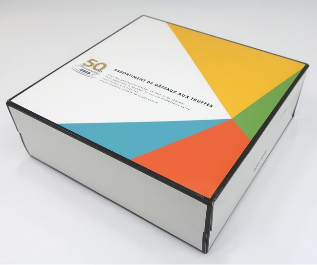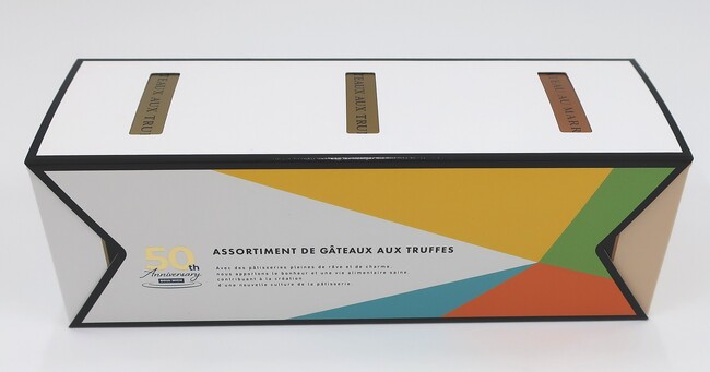 内容:「キッチンのダイヤモンド」とも呼ばれ、トリュフ・オ・ショコラの語源にもなった高級食材の「トリュフ」。トリュフの中でも風味づけに適した黒トリュフをゲランドの塩でブレンドした「トリュフ塩」と、デリケートな香りをオリーブオイルに閉じ込めた「トリュフオイル」を濃厚なチョコレート生地に入れた創業50周年記念にふさわしい特別な「トリュフケーキ」です。