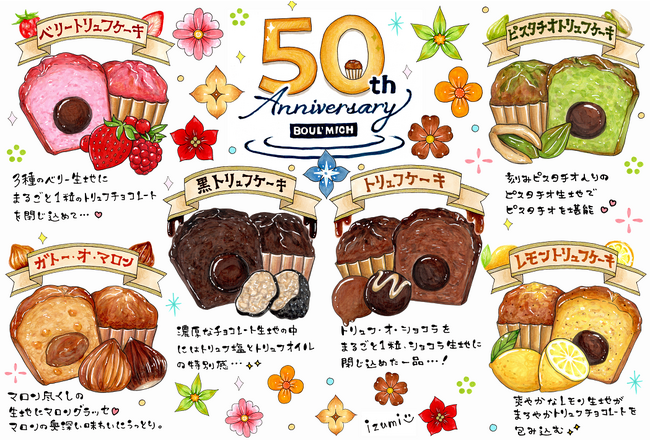 50th限定の「黒トリュフケーキ」を中心とした、トリュフケーキシリーズを鴨志田さん独自のイラストで書き下ろした「50th年アニバーサリーカード」プレゼントキャンペーンを店頭にて実施中です!