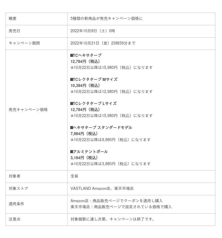 VASTLAND株式会社(本社:兵庫県姫路市/代表:田中悠貴)は、ブランド初となるTC素材を使用した「TCヘキサタープ」、「TCレクタタープ」を含む5商品を2022年10月8日(土)にAmazon店&楽天市場店で先行発売することを決定しました。また発売を記念して、Amazon店&楽天市場店限定で「発売キャンペーン」を開催します。