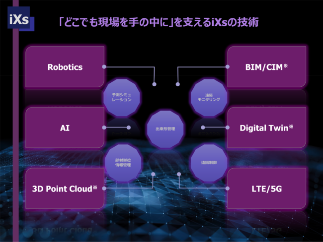 今回の出資により社会・産業インフラ領域を代表する大手事業会社との事業連携を加速させ、デジタル・トランスフォーメーション推進を目指して、イクシスは「どこでも現場を手の中に」を実現すべく、3D連動ソリューションとして各種サービスを展開していきます。これにより、各大手事業会社と連携して社会・産業インフラのデジタルツイン化※を実現していきます。