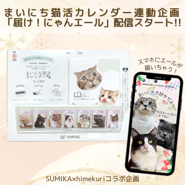 株式会社TIRAMISU(本社:東京都世田谷区 代表取締役:高澤 匡 以下「当社」)が運営する 猫ぐらしブランド「キミとワタシのSUMIKA」(以下「SUMIKA」)は、日めくりカレンダーの開発・販売を手がける株式会社ケープランニング(東京都文京区 代表取締役 木下 良)が運営する文具ブランド「himekuri」とのコラボレーションにて発売した付せん式日めくりカレンダー『SUMIKA×himekuri 卓上型ミニひめくりカレンダー&手帳セット2023 まいにち猫活カレンダー』のSNS連動企画『届け!にゃんエール』を2022年12月26日より公式LINEより配信いたします。カレンダー、文房具の枠を超えたデジタルとアナログのハイブリッドコンテンツです。