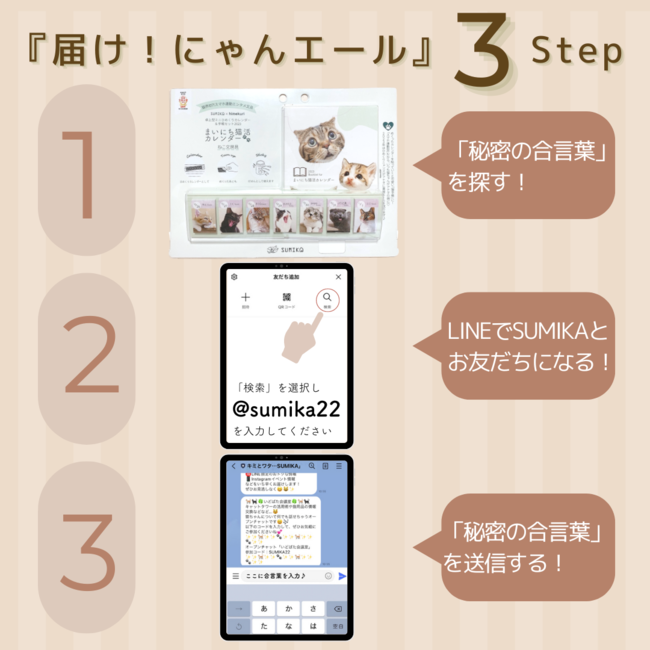 カレンダーパッケージに隠れている『秘密の合言葉』をSUMIKA公式LINEへ送信するだけでOK♪LINEアプリさえお持ちであれば、もちろん参加は無料!ニャンエールの画像はスマートフォンの待ち受けやSNSの背景などにもお使いいただけます。