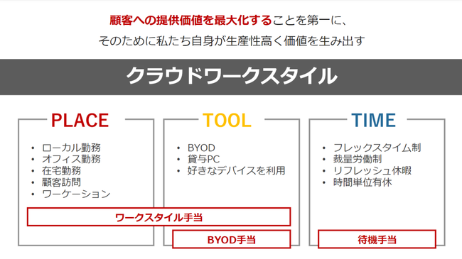 その一端として、これまで出社を前提とした在宅勤務の制度として運用してきた「クラウドワークスタイル」の制度を大幅に刷新し、チームおよび個人の生産性をいっそう高めることを目的に、はたらくための様々な環境を社員自らが選択できる仕組みとすることで、社員一人ひとりに適したはたらきかたの実現と、企業内の生産向上を実現し、顧客へ最適なサービスと価値提供を推進してまいります。