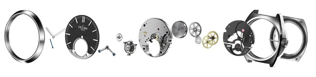 ケースは現代的なダークグレーで仕上げられており、青いネジはデルマの時計製造の伝統を表しています。ダイヤルはセーブルブラックで、グレイン仕上げが特徴です。 時針と分針はパラジウム、ニッケルメッキで、白いスーパールミノバ(R) BGW9 が塗布されています。
