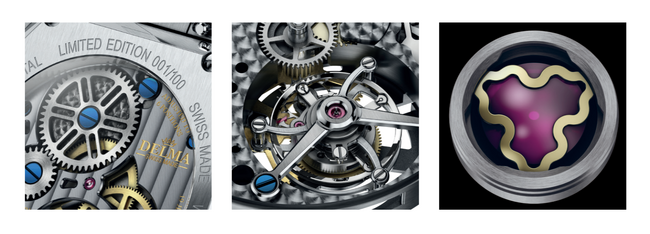 自社開発された100%スイス製トゥールビヨン/ Caliber DT100.01は、ラ・ショー・ド・フォンに拠点を置く、トゥールビヨンの開発に豊富な経験を持つ時計師 オリヴィエ・モリー氏(BCP Tourbillon社)と共同開発しました。高級時計製造の基準に合わせて美しく装飾されており、ベースプレートはペルラージュで装飾され、ケースの裏蓋から見えるブリッジにはコート・ド・ジュネーブとDELMAのロゴが装飾されています。105時間という驚異的なパワーリザーブを有する手巻きのCaliber DT100.01 は、合金ヒゲゼンマイや合金バランスホイールなどの非磁性コンポーネントで構成されており、最大2000ガウスの磁場に耐え、さらにテンプにはKIF Parechoc(キフ・パラショック社)が供給する衝撃吸収システムが取り付けられており、ムーブメントは最大 5000 Gまでの衝撃耐性があります。