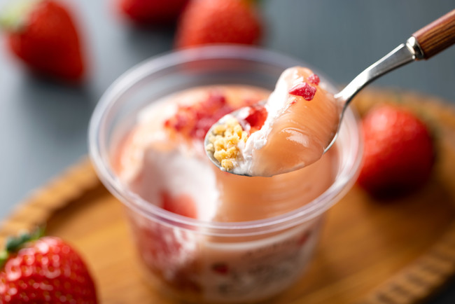 「いちびこ いちごのモンブランアイス」は、カフェの人気スイーツ「いちごのモンブランタルト」(※2)をイメージした商品。クッキークランチに、いちごソース、いちごミルクアイス、いちごあんを重ね、いちごキャンディーチップをてっぺんにのせたデザートアイス。何層にも重なるいちごの甘酸っぱい味わいがいろいろな食感で楽しめます。
