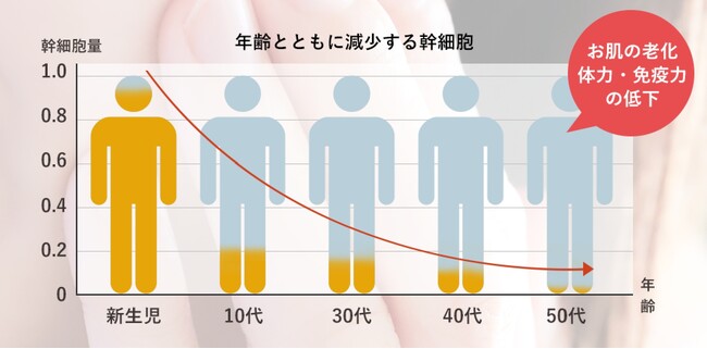 幹細胞の数は、新生児を100%とすると、10代後半にはおよそ10%、30代では4%、80代ではたった0.5%と、