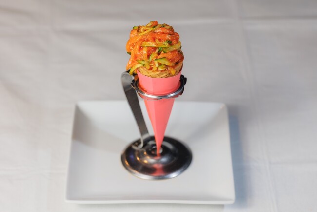 アイスクリームコーンをひっくり返すと、目にも鮮やかなユッケと濃厚な卵黄が飛び出します。