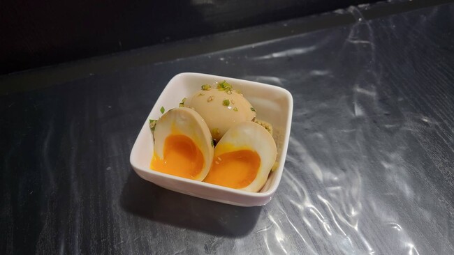 1個から注文可能の麻薬卵は、甘めのタレに鷹の爪でピリッとアクセントが効いた一品です。