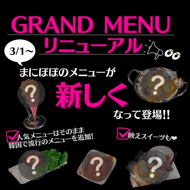 【韓国ダイニングまにぽぽ】は2023年3月1日よりグランドメニューをリニューアルします。