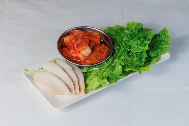塩麹に漬け込んだ柔らかい鶏ムネ肉に、キムチとまにぽぽ特製のサムジャンを乗せて、