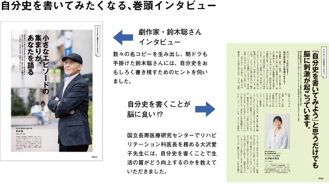巻頭では、国立長寿医療研究センターのリハビリテーション科医長の大沢愛子先生に、自分の過去を思い出すことや、それを文字にして表現することが、どう頭や心に良いのかを教えていただきます。また、朝の連ドラなどを担当した脚本家の鈴木聡さんには、自分の人生をおもしろく書き残すためのヒントをお伺いします。