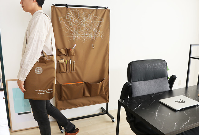 ポケットが付いたスクリーン部分を、くるくると巻き上げると、なんとハンガーラックに変身するのです。