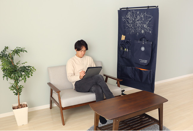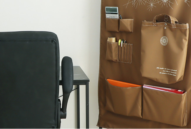 スクリーンには、A4ファイルがはいる大型ポケットが2つ、他にも大小さまざまなポケットが付いており、眼鏡ケースやリモコン、ペンなどが収納できます。リビングやデスクまわりの整理整頓にご活用いただける便利なウォールポケットです。