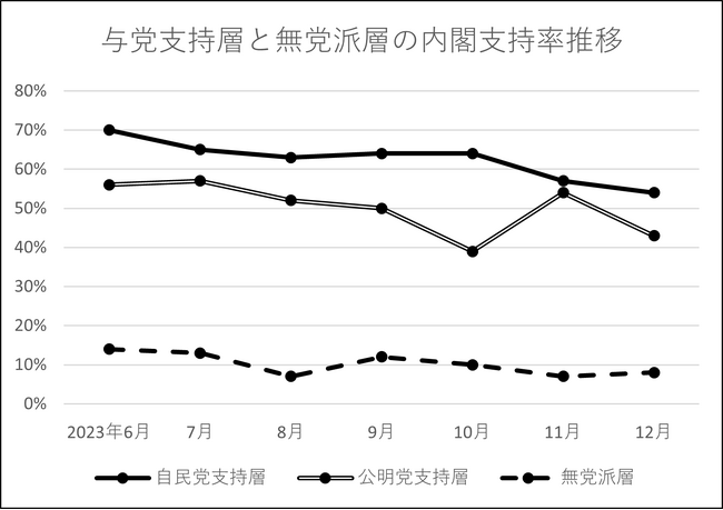 自民党支持層の内閣支持率は6月調査では70%あったが、今回の調査では54%まで下落した。公明党支持層の内閣支持率は43%となり、不支持率が過半数の51%に達して支持・不支持が逆転した。与党支持層の間で岸田首相を支える意識が薄れている状況と言えそうだ。「支持政党はない」と答えた無党派層の内閣支持率は8%だった。