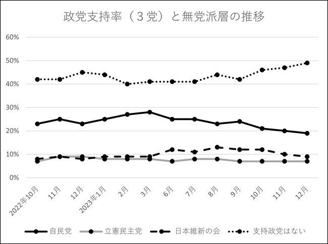 ■政党支持率は自民19%・維新9%・立憲7%・無党派49%