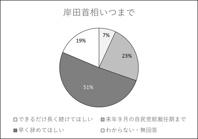岸田首相にいつまで首相を続けてほしいと思うかを尋ねたところ、「早く辞めてほしい」が51%と過半数を占め、「来年9月の自民党総裁任期まで」が23%、「できるだけ長く続けてほしい」はわずか7%だった。自民党支持層でも「できるだけ長く続けてほしい」は24%にとどまり、「来年9月の自民党総裁任期まで」が38%、「早く辞めてほしい」が24%と6割超が岸田総裁の再選を望んでいない結果となった。