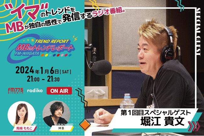 2024年1月6日(土)21:00〜スタートFM-NIIGATAラジオ新番組「MBのトレンドレポート」第1回目のスペシャルゲストは堀江貴文さん