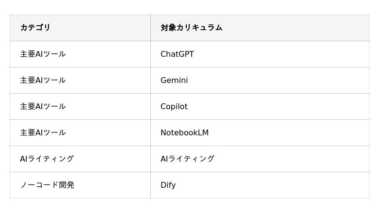 現在、以下のカリキュラムにおいてスキル証明課題にチャレンジできます。[表1: https://prtimes.jp/data/corp/164574/table/29_1_f98981d84fe5c38f654415dcb1dbe2b3.jpg?v=202602251015 ]